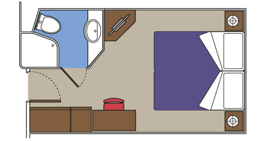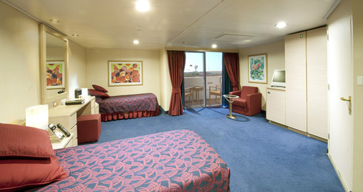Camas de solteiros que poderão ser convertidas em cama de casal (mediante solicitação), exceto nas cabines destinadas aos portadores de deficiência física. Armário espaçoso, Banheiro com chuveiro, TV, Telefone, Conexão de internet através de seu próprio laptop (serviço pago), Minibar e cofre, Ar condicionado. Suítes com área de 17m2.