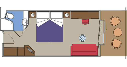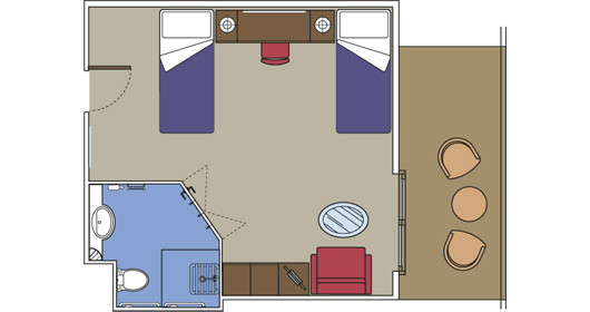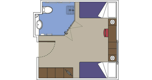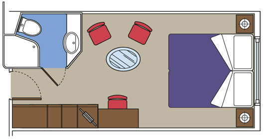 Camas de solteiros que poderão ser convertidas em cama de casal (mediante solicitação), exceto nas cabines destinadas aos portadores de deficiência física. Armário espaçoso, Banheiro com chuveiro, TV interativa, Telefone, Conexão de internet através de seu próprio laptop (serviço pago), Minibar e cofre, Ar condicionado. Suítes com área de 13m2.