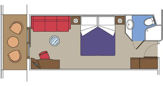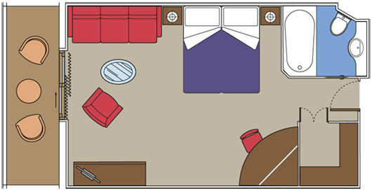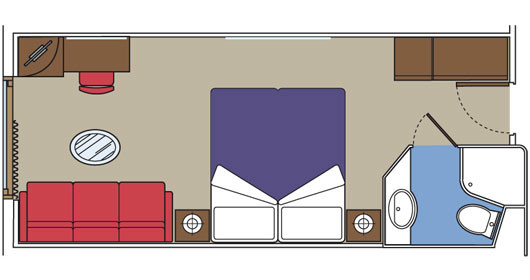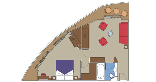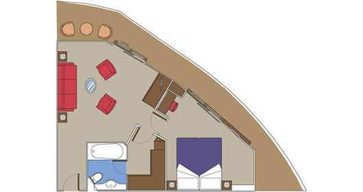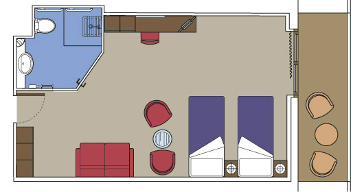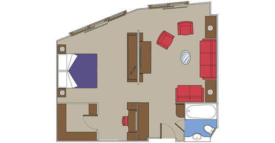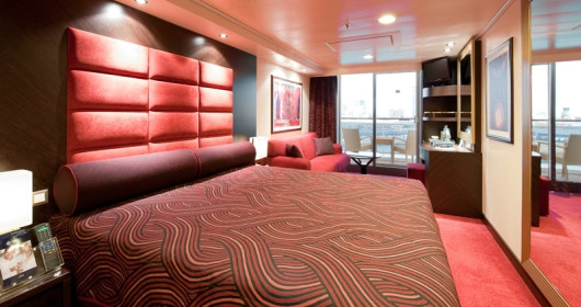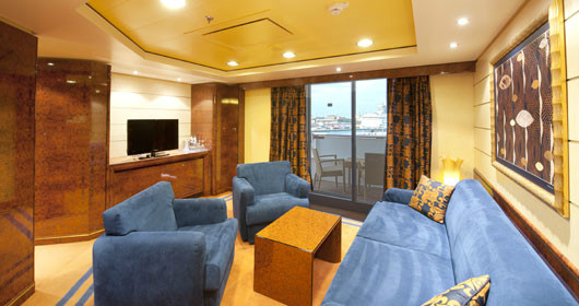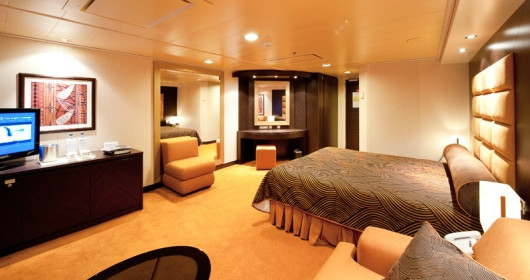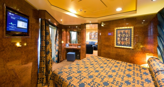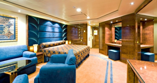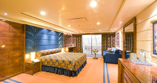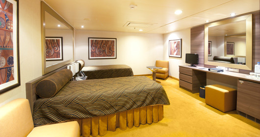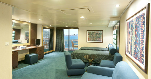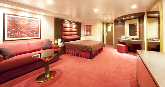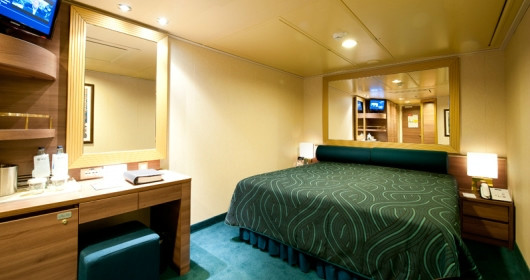 Cama de casal, ar condicionado, amplo armário com barra de segurança, televisão interactiva (ITV), rádio, telefone, telas de LCD Samsung. Equipamentos para acesso à internet (conexão tem uma taxa), videogame Nintendo Wii, mini-bar, cofre. Espaço interno: ≈39 m²